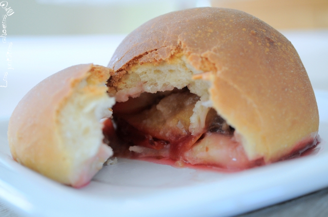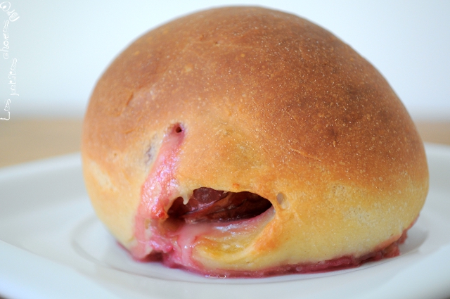 J’ai donc eu l’idée d’envelopper des prunes entières (dénoyautées quand même) dans une pâte briochée et, pour ajouter un peu de gourmandise, de farcir les prunes avec une crème à base de purée d’amande, qui rappelle un peu la frangipane.