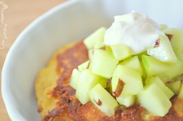 Servir les galettes chaudes ou tièdes, surmontées de salades de concombre et d’une petite cuillère de crème au sésame.