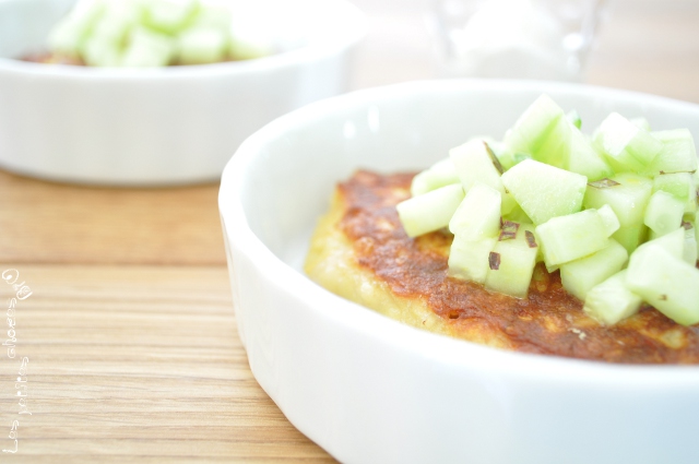 Petites galettes de pois chiche au Comté, fraîcheur de concombre et crème de sésame