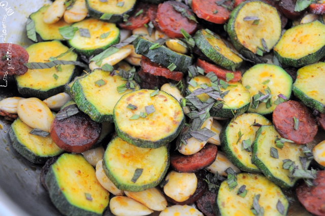 Poêlée de courgettes, amandes, chorizo, curry et menthe fraîche