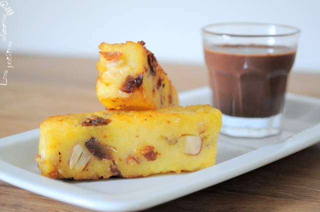 Pour cette fois, une recette un peu régressive, des bâtonnets de polenta aux fruits secs à tremper dans une sauce au chocolat. A manger avec les doigts, of course !