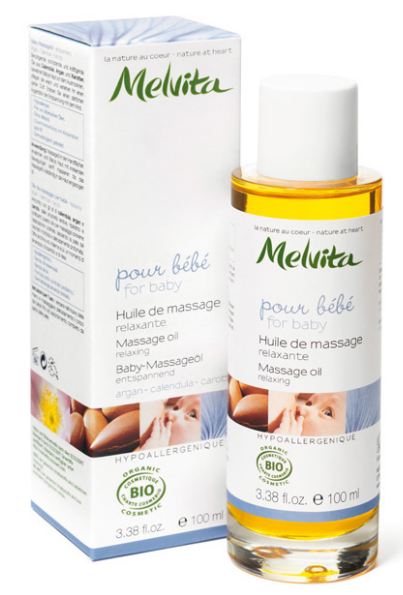 Et puis, il y a quelques semaines, je reçois un paquet surprise de Melvita qui contenait… un flacon d’huile de massage pour bébé !