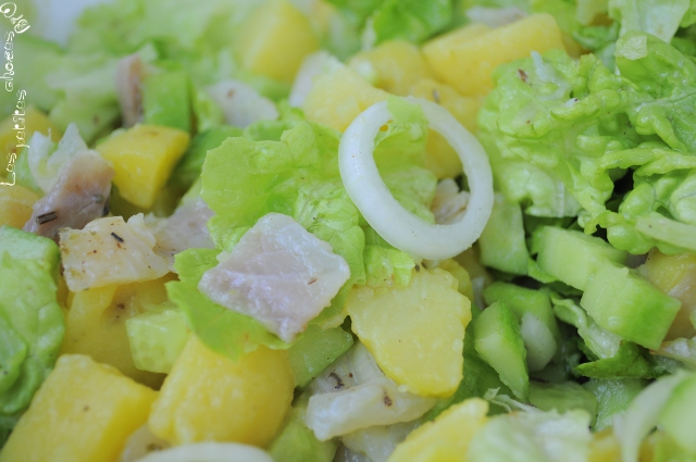 Je voulais une salade très fraîche, légère mais nourrissante. J’ai donc choisi d’associer le poisson fumé à du concombre, de la salade, des oignons nouveaux et des pommes de terres nouvelles ; pour l’assaisonnement, un peu d’huile d’olive, de poivre et le jus d’un citron.