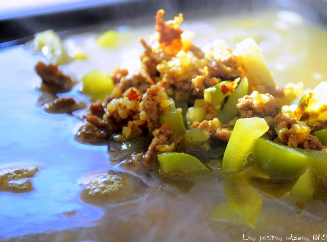 Bref, un p’tit poivron vert, un steak haché, du boulghour de petit épeautre, une bonne rasade d’épices et du bouillon par là-dessus, prêt en 15 minutes montre en main, voilà qui te requinque pour l’après-midi.
