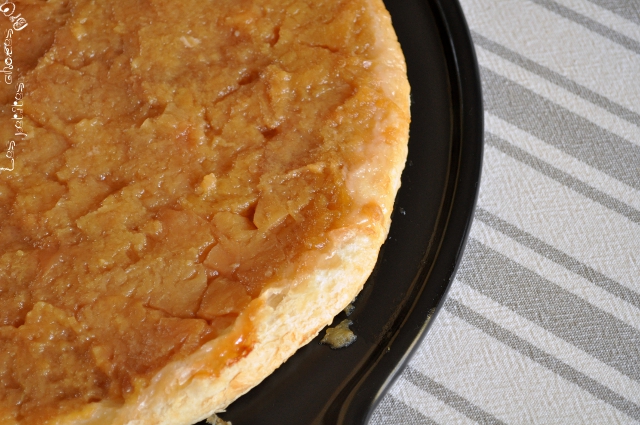 Moi je l’aime bien avec de gros quartiers de pommes légèrement caramélisés mais ma demoiselle préfère une version que je qualifierais de mixécrabouillée. En gros, ça fait un peu compote sur pâte.